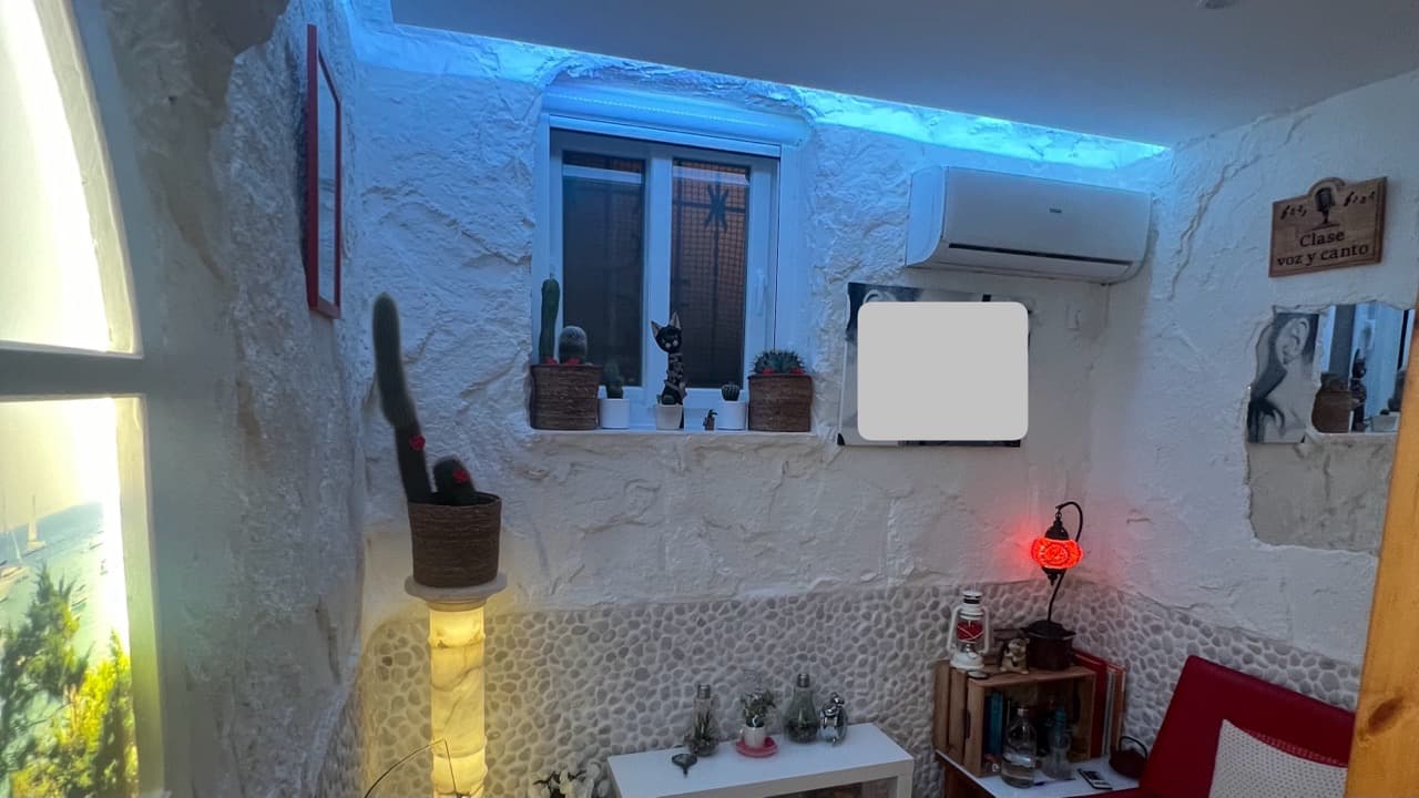 El techo se renovó con pladur y se incorporaron dos tipos de iluminación: una directa mediante focos y otra indirecta con luces LED y foseado, resaltando el revestimiento tipo roca y generando un ambiente cálido y acogedor. Además, se actualizaron la instalación eléctrica y la calefacción para mayor confort y eficiencia.